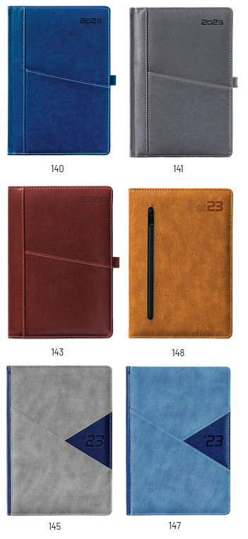 Kalendarz posiada przejrzysty układ kalendarium (PL,GB,D), krótką część informacyjną oraz kolorową mapę Polski. Bloki szyte nićmi, dwa kolory druku (szary-burgund), wstążka w kolorze okleiny. Przeszywana, skóropodobna okleina na tekturze z gąbką umożliwia wykonanie nadruków, głębokiego - termoprzebarwialnego tłoczenia i personalizacji laserowej. W poszczególnych modelach: kieszeń na telefon, uchwyt na długopis, kieszeń wewnętrzna, linijka na oprawie i pierwszej stronie, zamykane na gumkę lub magnes.
