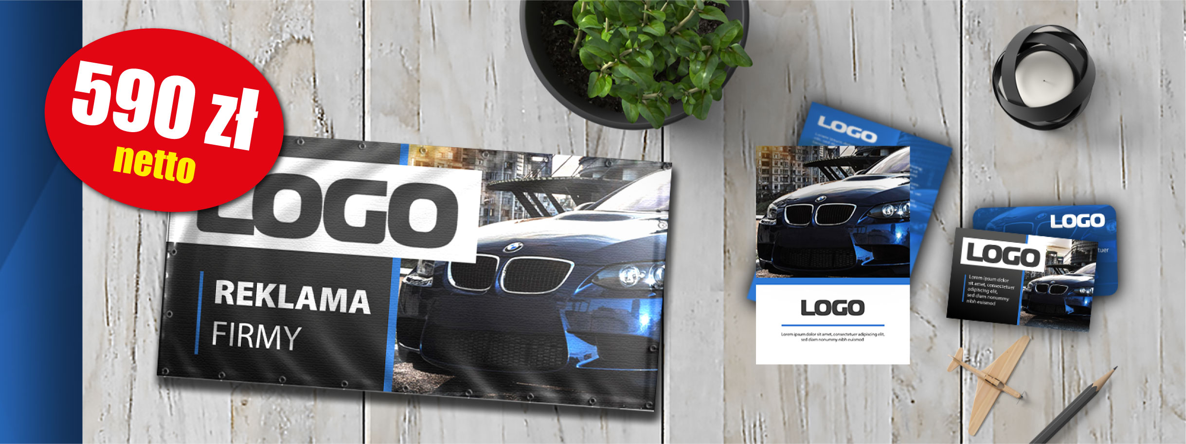 Karty firmowe + Baner + Ulotki w cenie netto 590 zł/kpl.